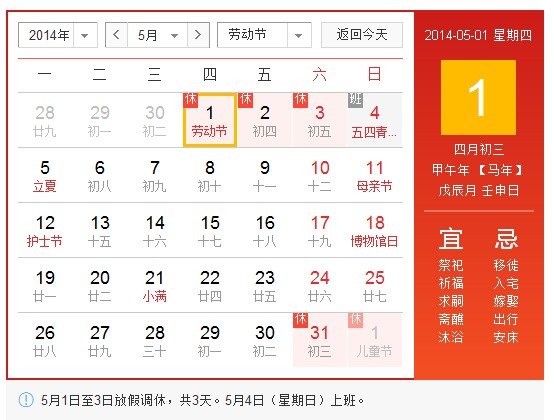 2014年5月1日(星期四)—2014年5月3日(星期六)放假調休,共三天。2014年5月4日(星期天)照常上班。