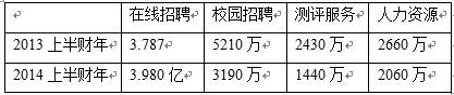 (1)在截至2013年12月31日的2014上半財年,智聯(lián)招聘總營(yíng)收為人民幣5.010億元(約合8270美元),高于前一財年的人民幣4.456億元,增長(cháng)12.4%。收入具體構成如下: