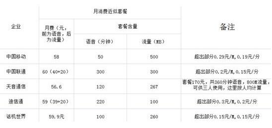 虛擬運營(yíng)商的資費套餐是否真如其宣傳那樣“美好”。由于各家企業(yè)套餐資費并不一致,我們以56-60元的月套餐維度來(lái)進(jìn)行比較。