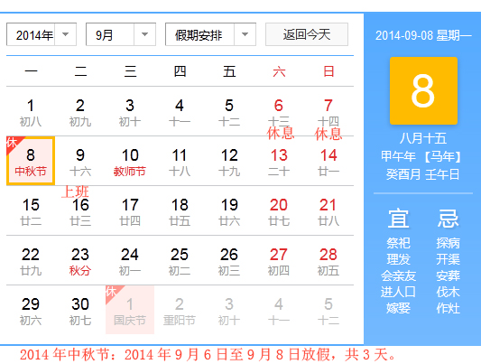 2014年中秋節放假安排