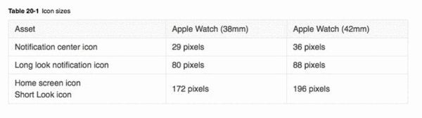 由于屏幕尺寸和機型不同,Apple Watch出現的圖標像素也就不同。比如,38毫米版Apple Watch上通知中心圖標像素應該是29,而42毫米版本上像素則為36。主屏幕圖標像素在38毫米版和42毫米版Apple Watch顯示的像素分別為172和196。