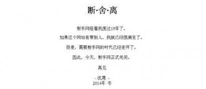22日,知名字幕分享網(wǎng)站射手網(wǎng)創(chuàng  )始人沈晟發(fā)表了一則名為“斷·舍·離”的公告,宣布“射手網(wǎng)正式關(guān)閉。”