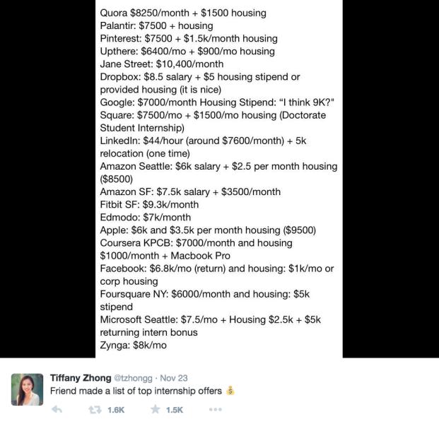 而從下圖(一個(gè)叫 Tiffany Zhong的Twitter網(wǎng)友披露出來(lái)的)可以看到現在更多科技巨頭給實(shí)習生開(kāi)出的工資。這一數字已經(jīng)比上述2月份Glassdoor的報告有所增長(cháng)(或許是將津貼包含了進(jìn)去)。比如Facebook的實(shí)習薪資為6800美元,外加1000美元的住房補貼。谷歌的為7000美元基本薪資外加住房津貼,可能達9000美元。蘋(píng)果的為6000美元,外加3500美元住房津貼。Quora的為8250美元,外加1500美元住房津貼。亞馬遜西雅圖為6000美元,外加2500美元住房津貼,亞馬遜舊金山為7500美元,外加3500美元住房津貼。連Fitbit這種新創(chuàng )公司也到了9300美元。