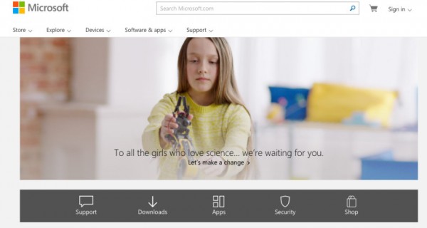 目前,微軟官網(wǎng)首頁(yè)的重點(diǎn)是婦女影響技術(shù),這是一個(gè)敏感的話(huà)題,因為科技業(yè)傳統上由男性主導。就目前的布局而言,英雄形象的重點(diǎn)是對科學(xué)感興趣的少女,而頁(yè)腳圖像是11位女性科技業(yè)領(lǐng)導者,她們正在改變創(chuàng )新生態(tài)系統。