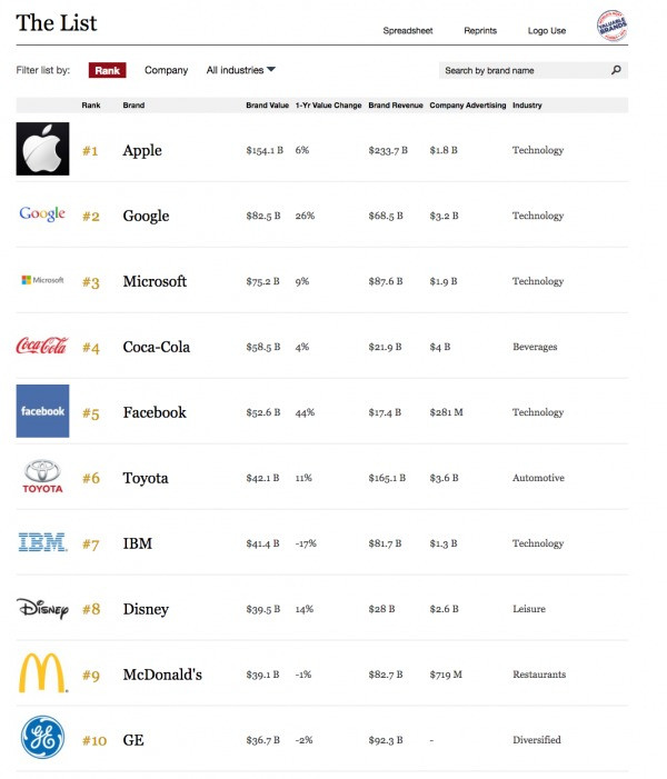 完整榜單:福布斯全球最具價(jià)值品牌排行榜