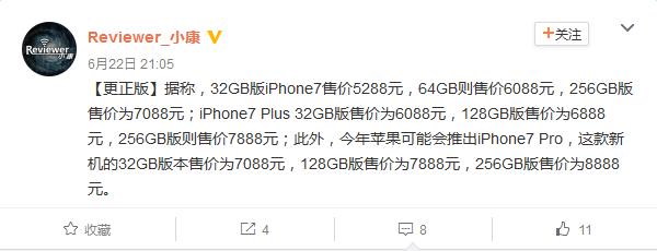 據國內網(wǎng)友@Reviewer_小康在微博中爆料即將發(fā)布的iPhone 7將會(huì )以32GB起步,共有三個(gè)版本供消費者選擇。其中標準版iPhone 7將會(huì )取消128GB版本,起售價(jià)格為5288元;iPhone 7 Plus起售價(jià)格為6088元,沒(méi)有64GB版本;而iPhone 7 Pro起售價(jià)格為7088元。