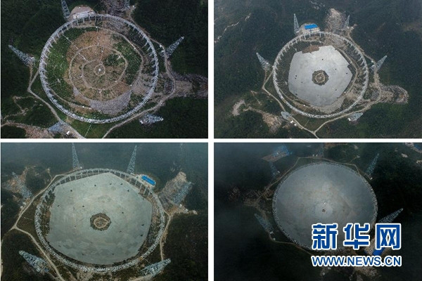 這張拼版照片為FAST項目拼裝第一塊反射面板(左上,2015年8月2日攝)、FAST反射面板安裝近半(右上,2015年12月16日攝)、FAST項目反射面板安裝近八成(左下,2016年3月9日攝)、FAST項目反射面板安裝完成(右下,2016年7月3日攝)。新華社記者 歐東衢 攝