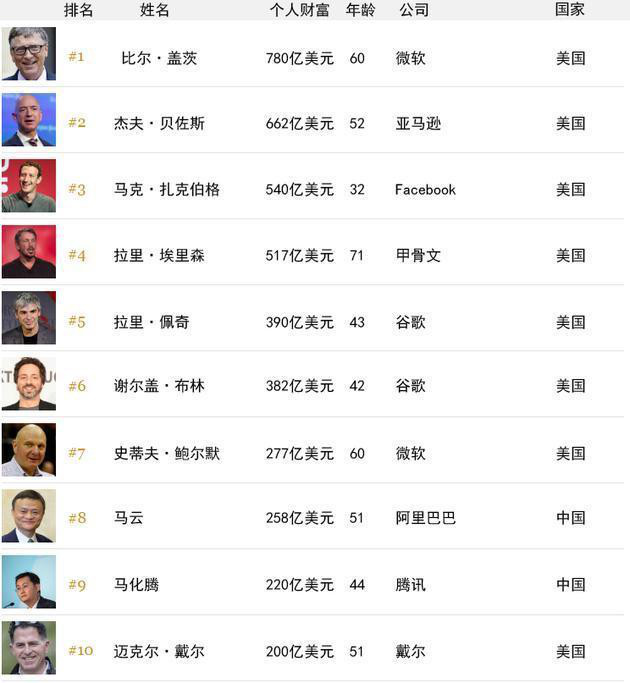 全球科技富豪榜:蓋茨第一 馬云第八