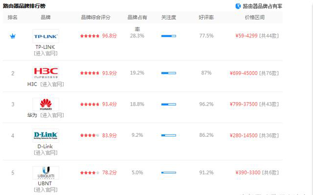 前五名榜首依次為T(mén)P-LINK、H3C、華為、D-LINK、UBNT,這個(gè)產(chǎn)品的排名說(shuō)明了2個(gè)問(wèn)題。